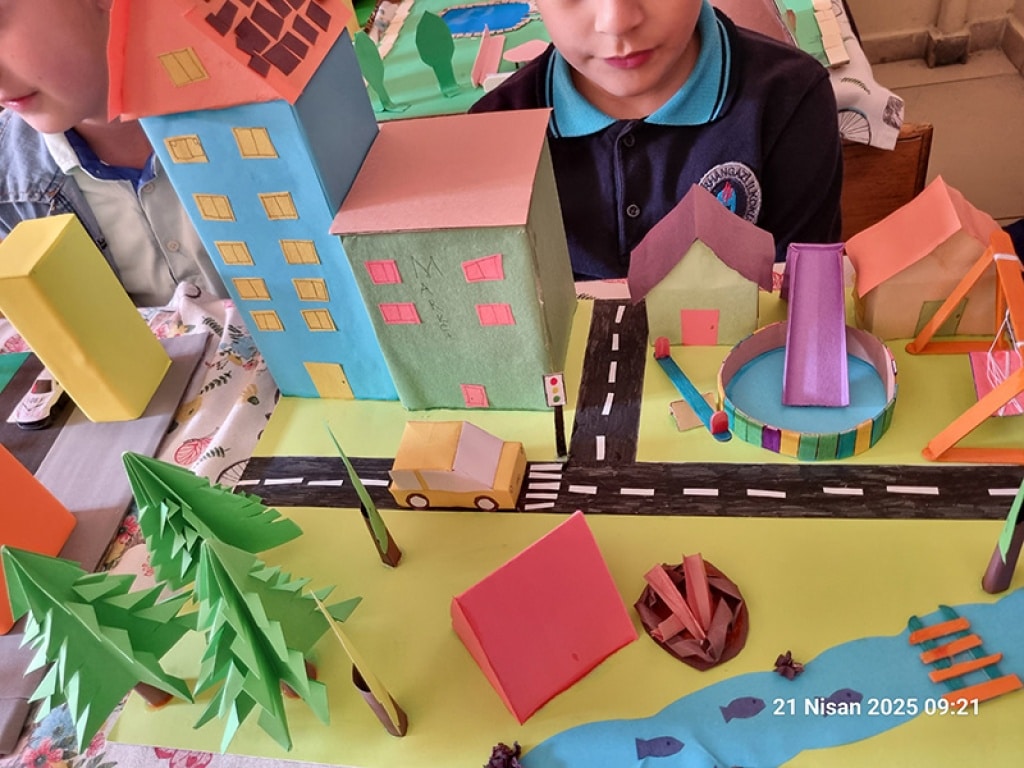 Okulumuz Orhangazi ilkokulu 3/C sınıfı öğrencileri Fen Bilimleri dersinde doğal ve yapay çevre konusunu öğrenip atık malzemeler kullanarak kendi yapay çevrelerinin 3 boyutlu maketlerini yaptılar ve hazırladıkları maketleri kullanarak arkadaşlarına bir sunum gerçekleştirdiler.